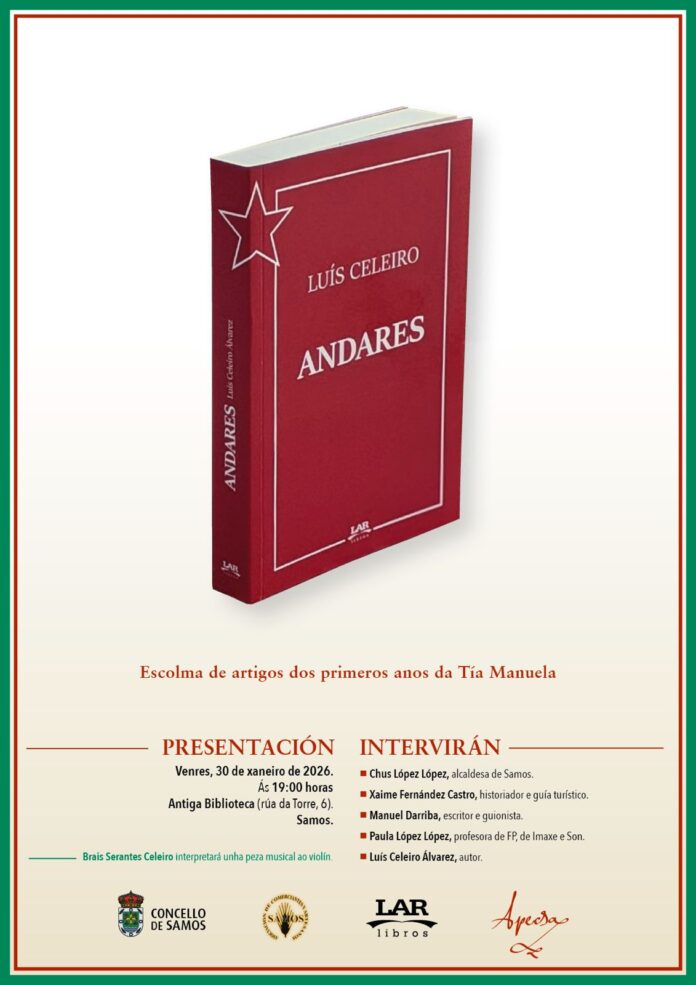 No acto de presentación acompañarán ao autor, a alcaldesa de Samos, Chus López López; Xaime Fernández Castro, historiador e guía turístico; o xornalista, Manuel Darriba Blanco e Paula López López, profesora de FP, de Imaxe e Son. A cita, con entrada libre, completarase coa actuación de Brais Serantes Celeiro, que interpretará unha peza musical ao violín.