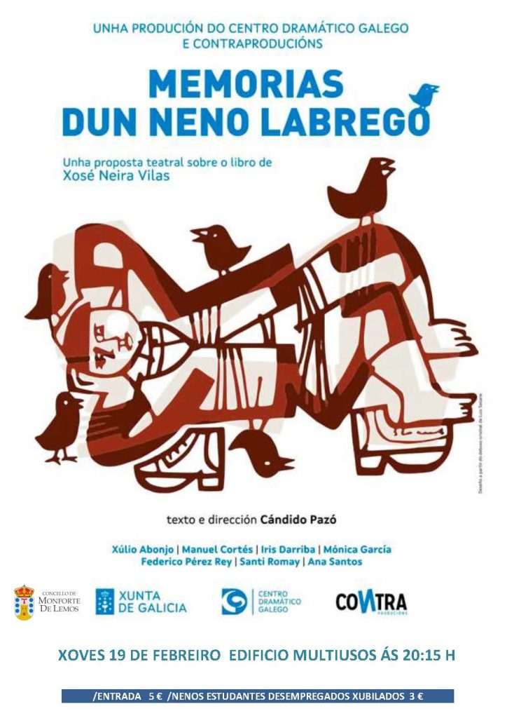 Nova cita co teatro este xoves, 19 de febreiro ás 20.15 horas, no Edificio Multiusos. A función, organizada polo Concello de Monforte a través do circuíto da Rede Galega de Teatros e Auditorios, é “Memorias dun neno labrego”, unha nova adaptación teatral da emblemática novela do escritor Xosé Neira Vilas.