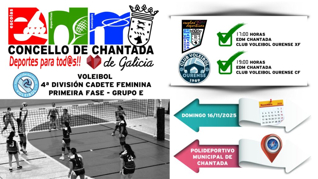 Este domingo, 16 de novembro, celébranse no Pavillón Municipal de Chantada dous encontros da primeira fase do grupo E da cuarta división cadete femenina que enfrontarán ao EDM Chantada e ao Club Voleibol Ourense XF, ás 17:00h e ás 19:00h. As locais comezan competición co CVO, un club fundado no ano 1989 que conta cunha forte estrutura de canteira con máis de 250 rapaces e rapazas.