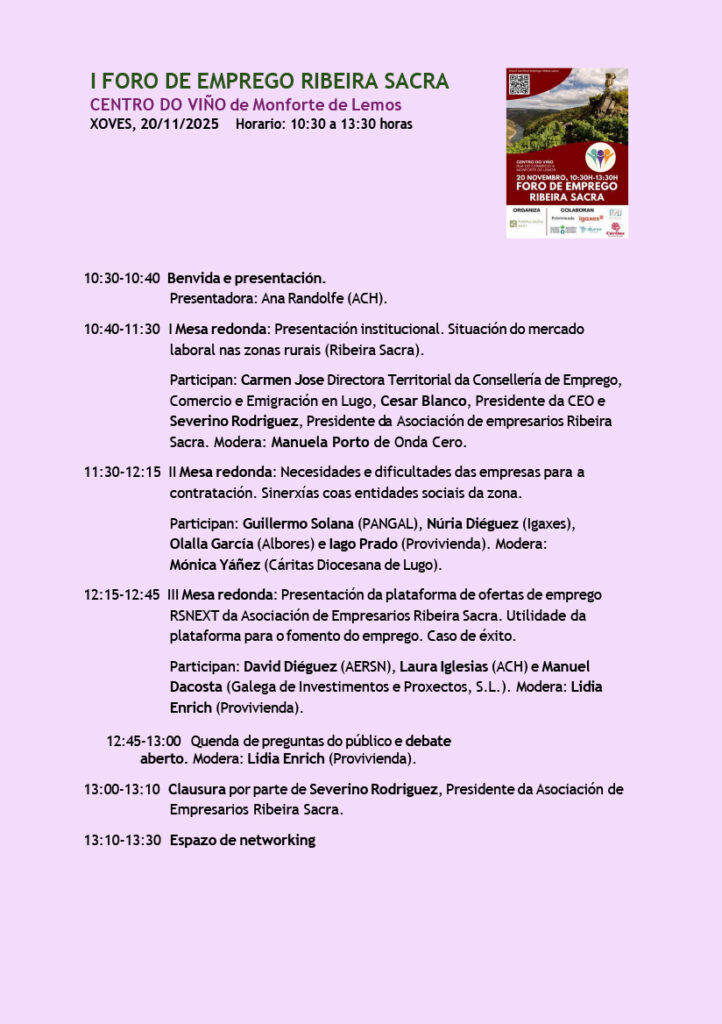 - 12:15-12:45 Mesa redonda: Presentación da Plataforma de Ofertas de Emprego RS NEXT da Asociación de Empresas Ribeira Sacra Next. Utilidade da plataforma para o fomento do emprego. Caso de éxito. Participan: David Diéguez (xerente, Asociación de Empresas Ribeira Sacra Next), Laura Iglesias (ACH) e Manuel Dacosta (Galega de Investimentos e Proxectos, asociada a Ribeira Sacra Next). Modera: Lidia Enrich (Provivienda).