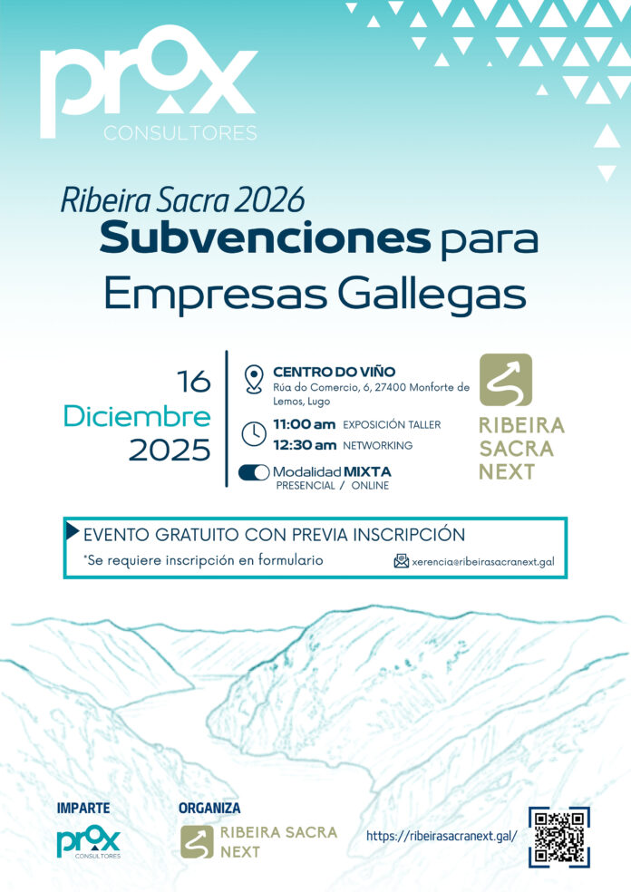 A seguinte actividade será o martes, 16 de decembro, no Centro do Viño da Ribeira Sacra en Monforte de Lemos. Desde as 11:00h levarase a cabo por parte de PROX Consultores unha explicación das axudas ás que poderán acceder as empresas galegas para Investimento, Adegas, Rural, Emprendemento, Traballo, Turismo ou Dixitalización. Os técnicos encargados de ofrecer a charla aclararán as dúbidas e preguntas que poidan xurdir e rematará a xornada formativa con sesión de networking entre as persoas asistentes.