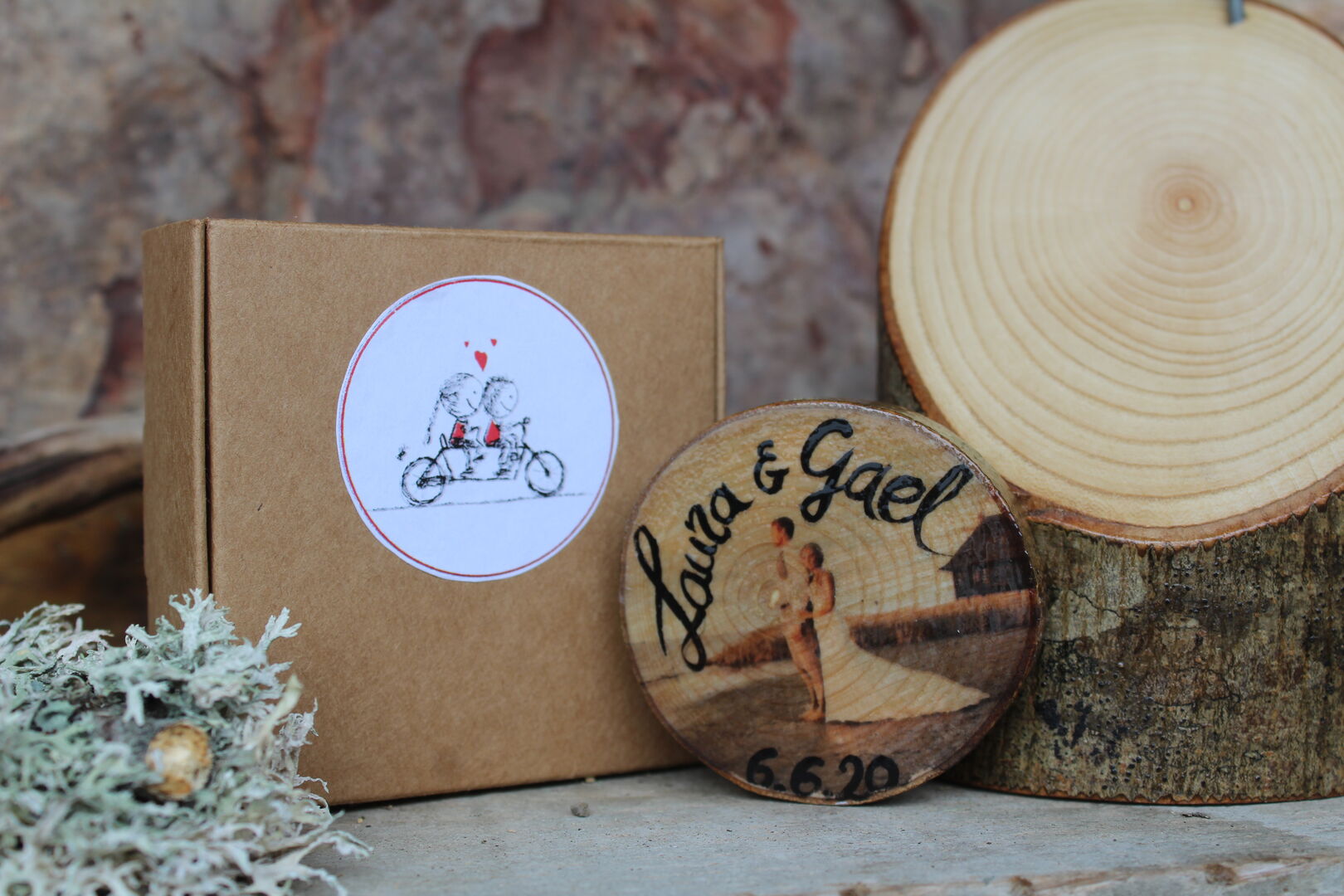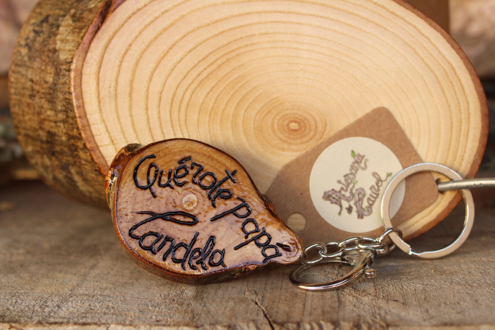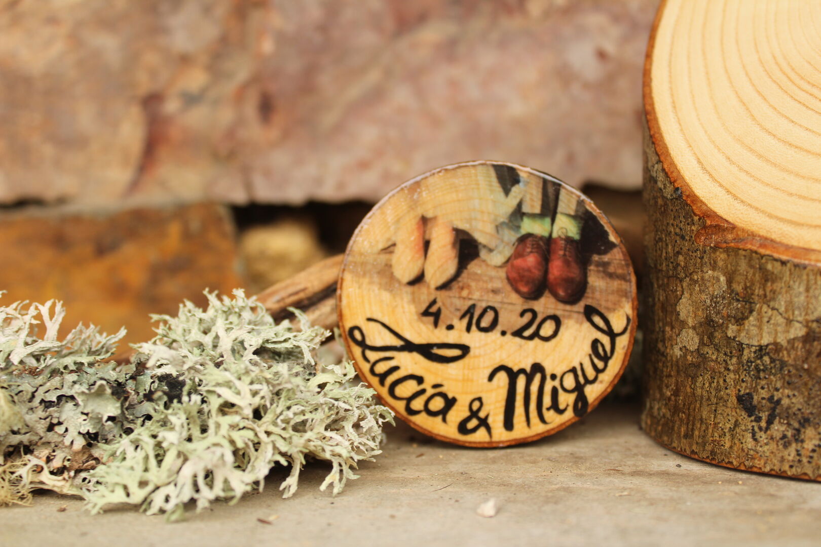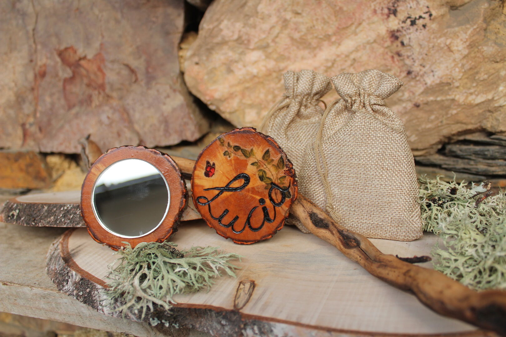 Marcos para fotos, chaveiros, imáns, colgantes, broches… bixutería en xeral, letreiros, detalles de voda e tamén merchandising para empresas impregnando os logos na madeira. Cando me preguntan “pódese poñer isto?”, eu dígolles que se pode poñer o que se queira (risas).