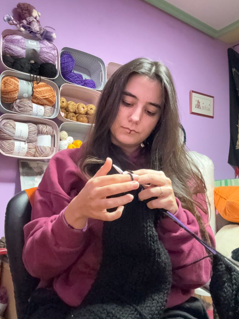 Aínda que me gusta tocar moitas técnicas, se teño que escoller, sen dúbida quedo co gancho. É co que máis gozo porque me permite crear personaxes dende cero e xogar coas formas, cun pouco de la e unha agulla de gancho podo facer dende peluches ata roupa, accesorios ou cadros.