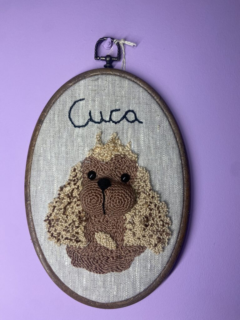 Sobre o que máis saída ten, os reis son os chaveiros. Gustan moitísimo porque os nenos cólganos das mochilas ou das cremalleiras das chaquetas, e así séntense acompañados por eles durante todo o día, é como se levaran un pequeno amigo de fío con eles ao colexio. E despois están os cadros de punch needle personalizados, que tamén teñen moito éxito. Sobre todo os de mascotas, que quedan xenial coas texturas que dá esta técnica combinada co gancho. É un traballo moi especial porque a xente busca ter un recordo diferente e con moito relevo dos seus peludos.