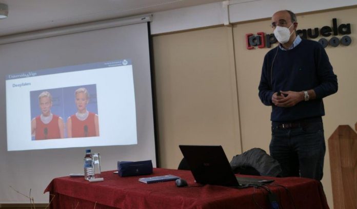 Fernando Pérez-González presentou tamén algunhas das ferramentas que desenvolven na súa investigación na Escola de Enxeñaría de Telecomunicación da Universidade de Vigo que permiten facer de “detectives de imaxes”. Neste senso mostrou algúns divertidos exemplos de manipulación e como funciona o popular “Deepfake” co que se poden construír vídeos falsos con aparencia de verosímiles, e que están a facer os investigadores para poder detectalos.