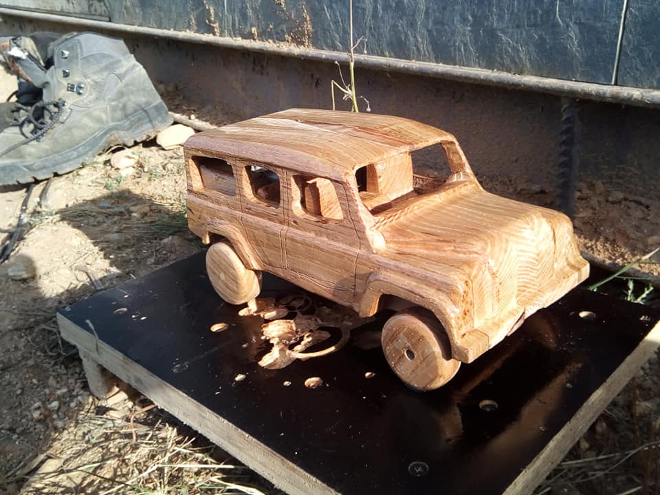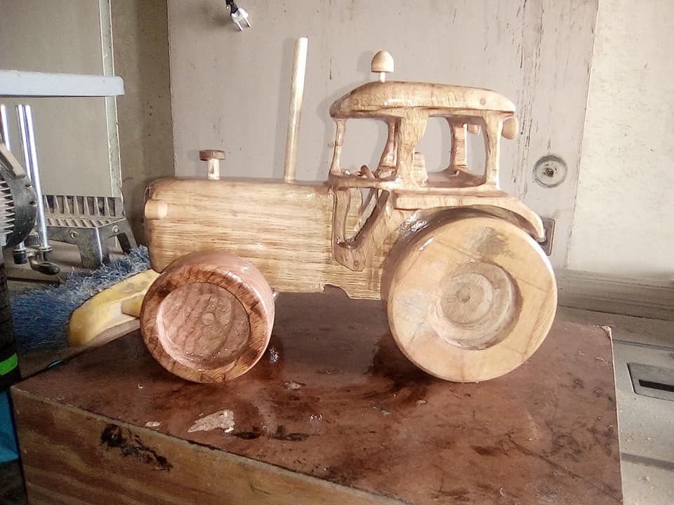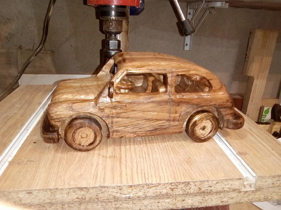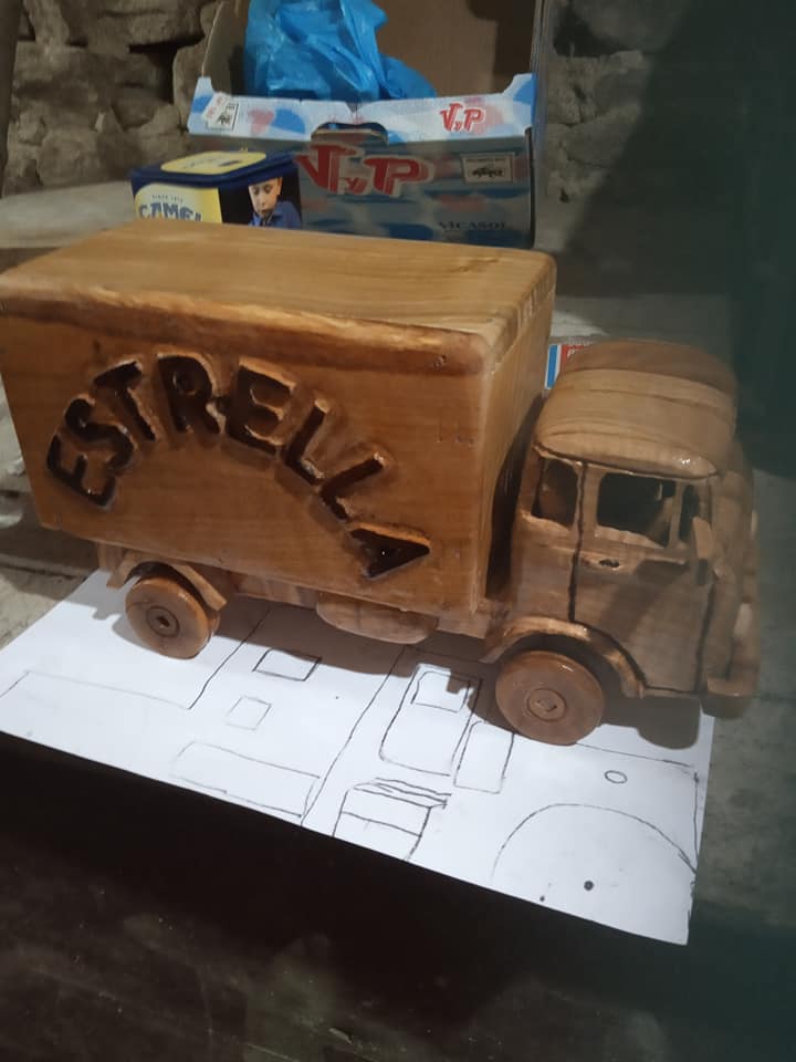 Empecei facendo caixiñas e vehículos que sempre me gustaron. Camións, coches, tractores, motos, maquinaria… Como traballei sempre con maquinaria é un tema que me apaixoa e creo que se nota nas obras que fago. Despois fun ampliando e facendo un pouco de todo, cadros, lámpadas, nomes propios de persoas tallados, nomes para locais comerciais, reloxos, escudos… E moitos dos encargos son personalizados. A xente pídeme algo concreto e eu sempre lles digo “non hai nada imposible” (risas).