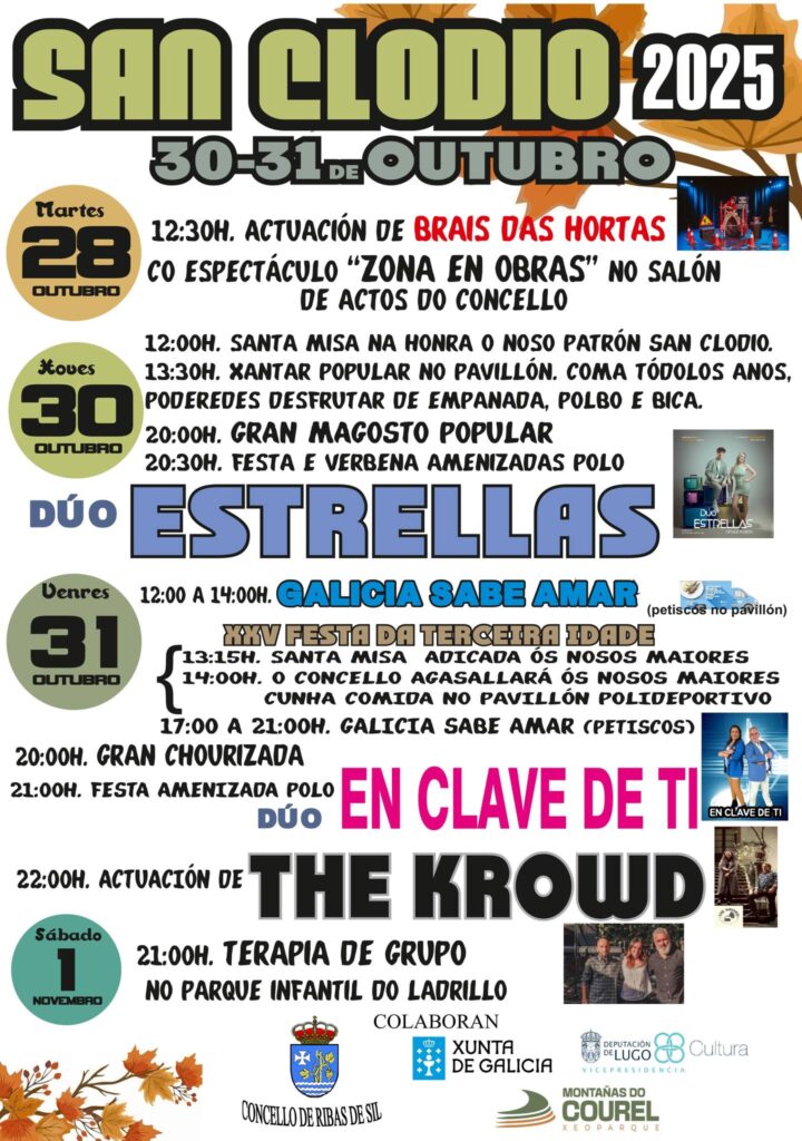 Este xoves 30 de outubro xa houbo actividade festeira en San Clodio, empezando ás 12:00 h. coa Misa na honra ao seu Patrón, que lle dá o nome á vila. A continuación, ás 13:30 h., tivo lugar un xantar popular no Pavillón a base de empanada, polbo e bica para toda a xente que se apuntou.