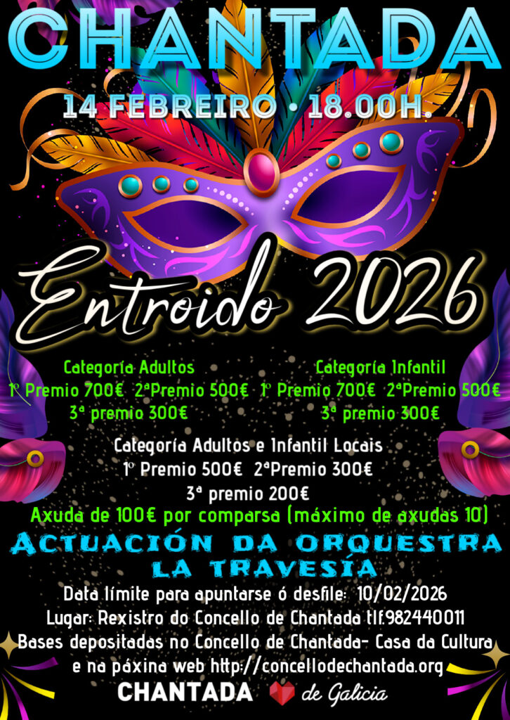 O Concello de Chantada, co obxectivo de promocionar e conservar as tradicións vinculadas co Entroido, organiza o Desfile de Comparsas que se celebrará o sábado, 14 de febreiro; ademais de colaborar tamén co Entroido Ribeirao, de especial interese polo seu carácter etnográfico e que comeza as celebracións o día 1 de febreiro.