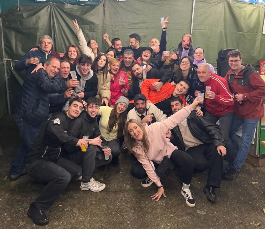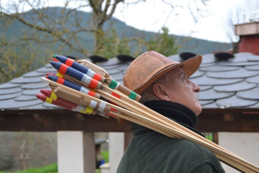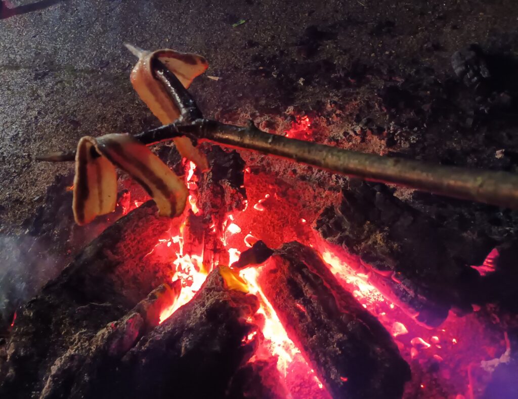 Unha pequena fogueira recibe aos visitantes sobre as 21:00 h. ao tempo que voluntarios e voluntarias da asociación asan chourizos nunha grella. A medida que a xente vai chegando dáselles un anaco de panceta, un anaco de pan, un vaso de viño e un espeto para poder achegar a vianda de porco ao lume. Ver os espetos da xente encarados uns contra outros coa panceta na punta enriba das brasas é unha estampa digna de ver e de vivir.