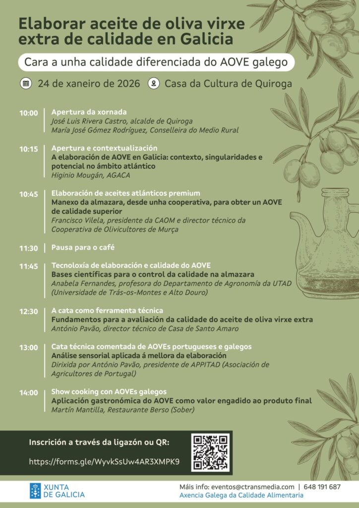 Baixo o título de “Elaborar aceite de oliva virxe extra de calidade en Galicia. Cara a unha calidade diferenciada do AOVE galego” reuniranse diversos expertos que falarán sobre a elaboración do Aceite de Oliva Virxe Extra. Está previsto que os relatorios comecen ás dez da mañá tras a apertura da xornada por parte do Alcalde de Quiroga, José Luis Rivera, e da Conselleira do Medio Rural, María José Gómez Rodríguez.