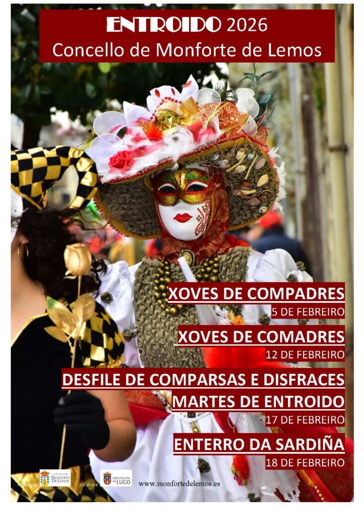 O día grande do Entroido en Monforte será o martes 17 de febreiro. O prazo de inscrición para participar no concurso do Desfile de comparsas e disfraces estará aberto no Rexistro do Concello, ou a través da Sede Electrónica do mesmo, ata o 13 de febreiro ás 14:00 h.